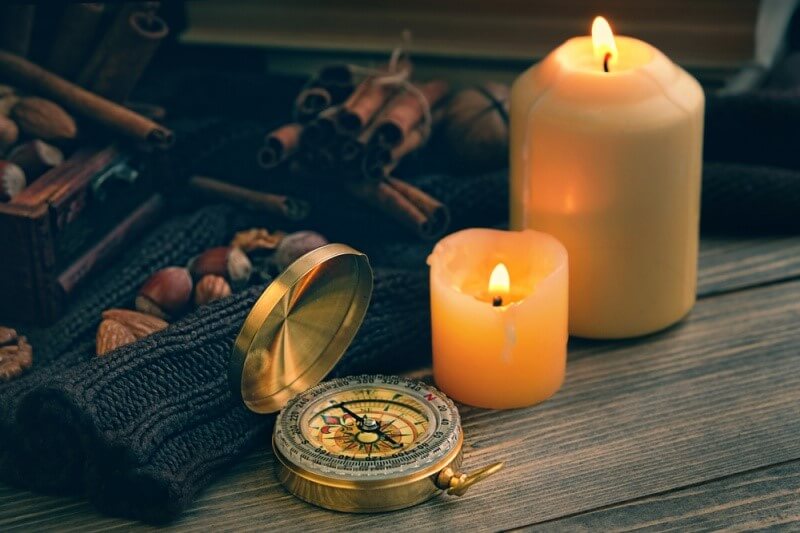 Depois de acender o incenso com os fósforos, faça o mesmo com as velas. O primeiro que você deve acender é aquele que é colocado mais a leste. Para ter certeza de que está correto, use a bússola.