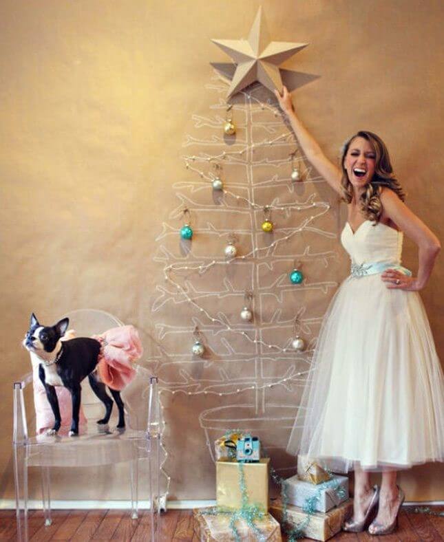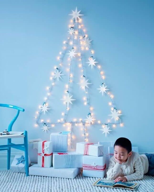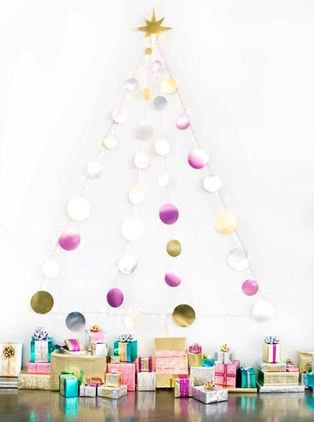 Coloque suas luzes de Natal em forma de triângulo e adicione alguns círculos de papelão brilhantes, bem como uma grande estrela para coroa. Tão simples como isso, você terá uma árvore criativa para o papai Noel deixar seus presentes.