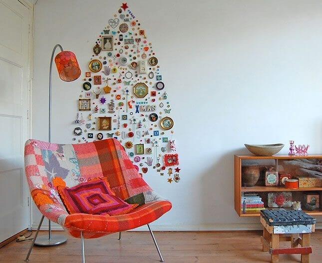 Recolha vários quadros com fotos, ímãs e outras lembranças que você tem de suas viagens, como pequenos pratos e estatuetas. Então, tente fazer uma composição de uma árvore de Natal desenhada com todos esses elementos.