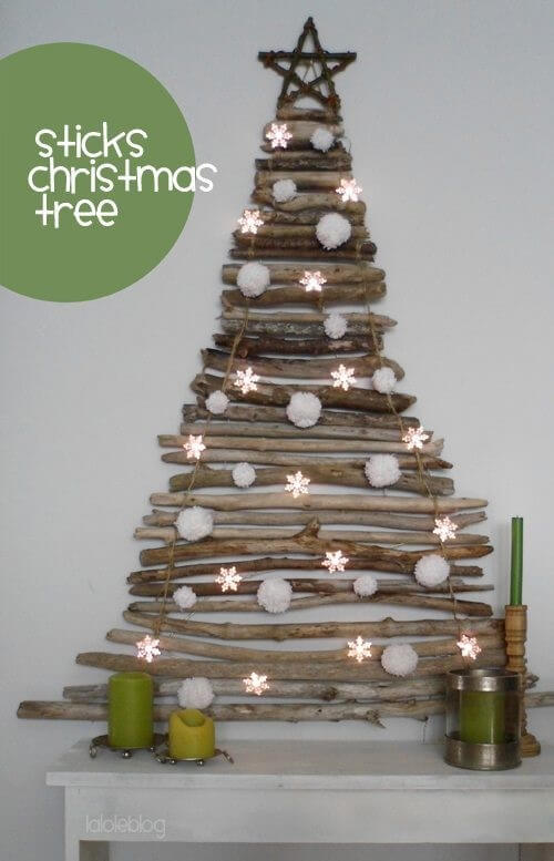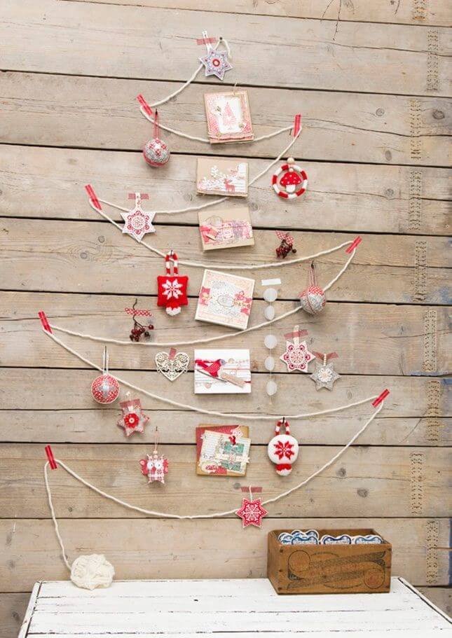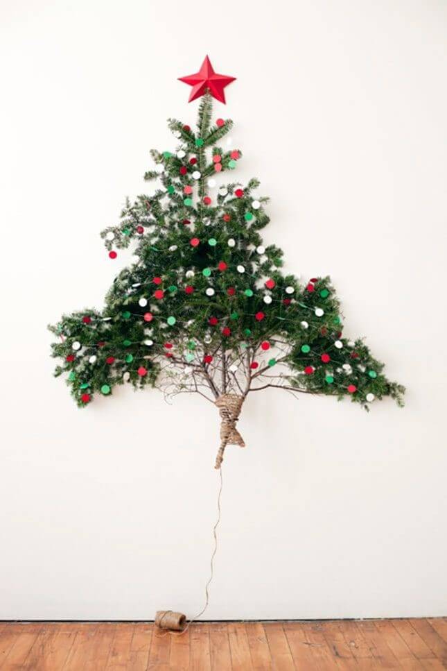 Pegue alguns galhos naturais, junte-os a uma corda, pendure com um gancho na parede e decore como qualquer árvore de Natal.