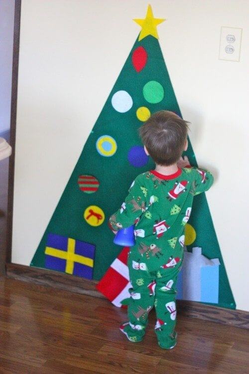 Outra boa invenção para as crianças são as árvores de feltro de Natal com as quais elas podem brincar quando quiserem. Você apenas tem que fazer um grande triângulo de feltro verde e, em seguida, vários enfeites de feltro de Natal que a criança pode colocar na árvore da maneira que quiser.