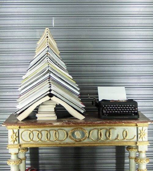 Outra boa proposta para livrarias e leitores fiéis é empilhar vários livros fechados e depois vários abertos (de maior para menor). Tão simples como isso, você pode obter sua árvore de Natal que você também pode coroar com uma estrela ou decorar com bolas e outras decorações de Natal.