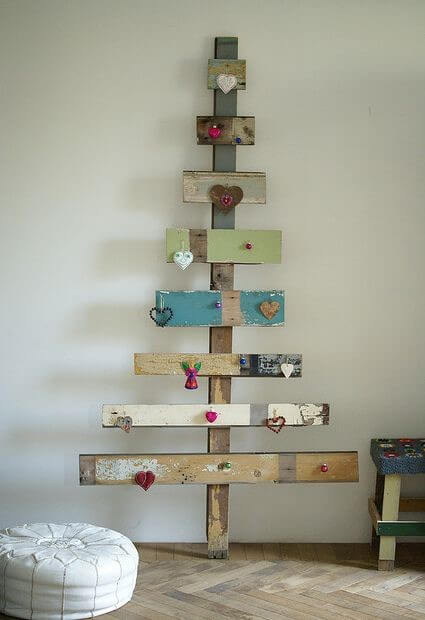 Desmonte um palete completamente, separando cada uma de suas mesas. Em seguida, junte dois para servir como guia vertical, depois corte e prenda o restante das tábuas horizontais do palete, que vai de maior para menor (de baixo para cima) para obter a forma de uma árvore de Natal. Finalmente, você pode pintar as placas e adicionar algumas decorações de Natal.