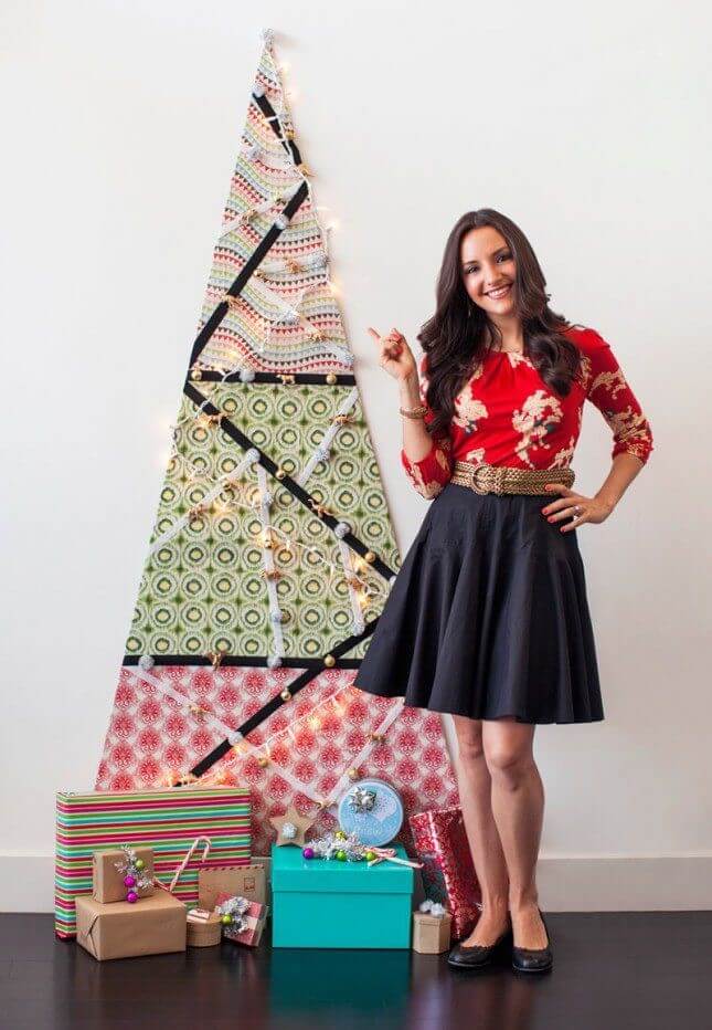 Se você gosta de costura, você pode querer tirar proveito de sua habilidade e fazer uma árvore de Natal de tecido. Utilize como base um grande cartão triangular e depois tecidos aderentes e adicione enfeites como luzes e bolas.